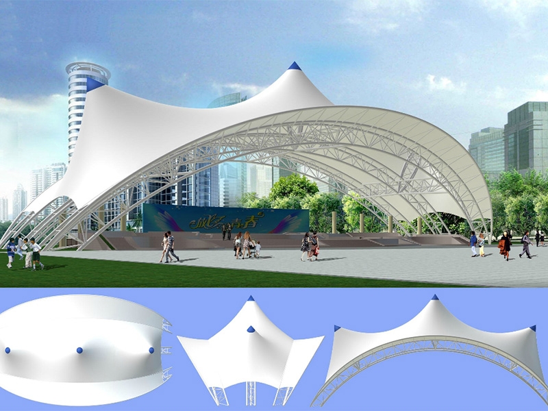 1、舞臺張拉膜結構的共同曲面外形使其具有激烈的雕塑感,膜面經過張力到達自平衡。