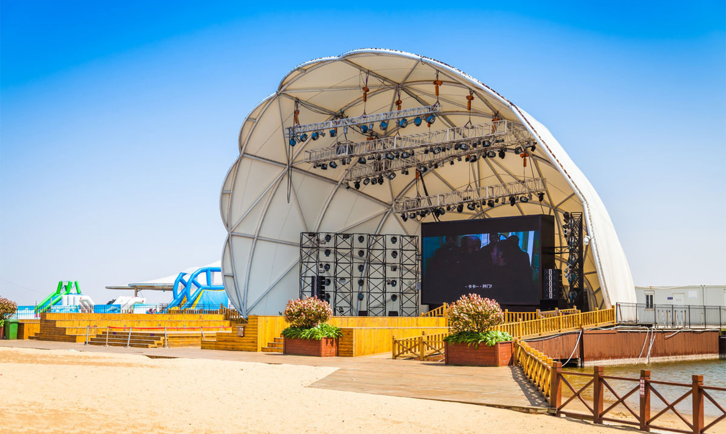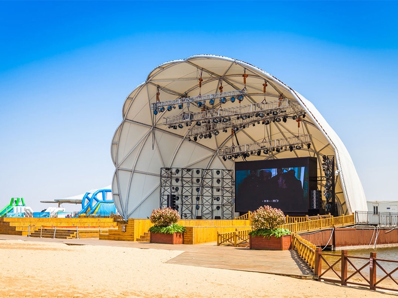 1、舞臺張拉膜結構的共同曲面外形使其具有激烈的雕塑感,膜面經過張力到達自平衡。