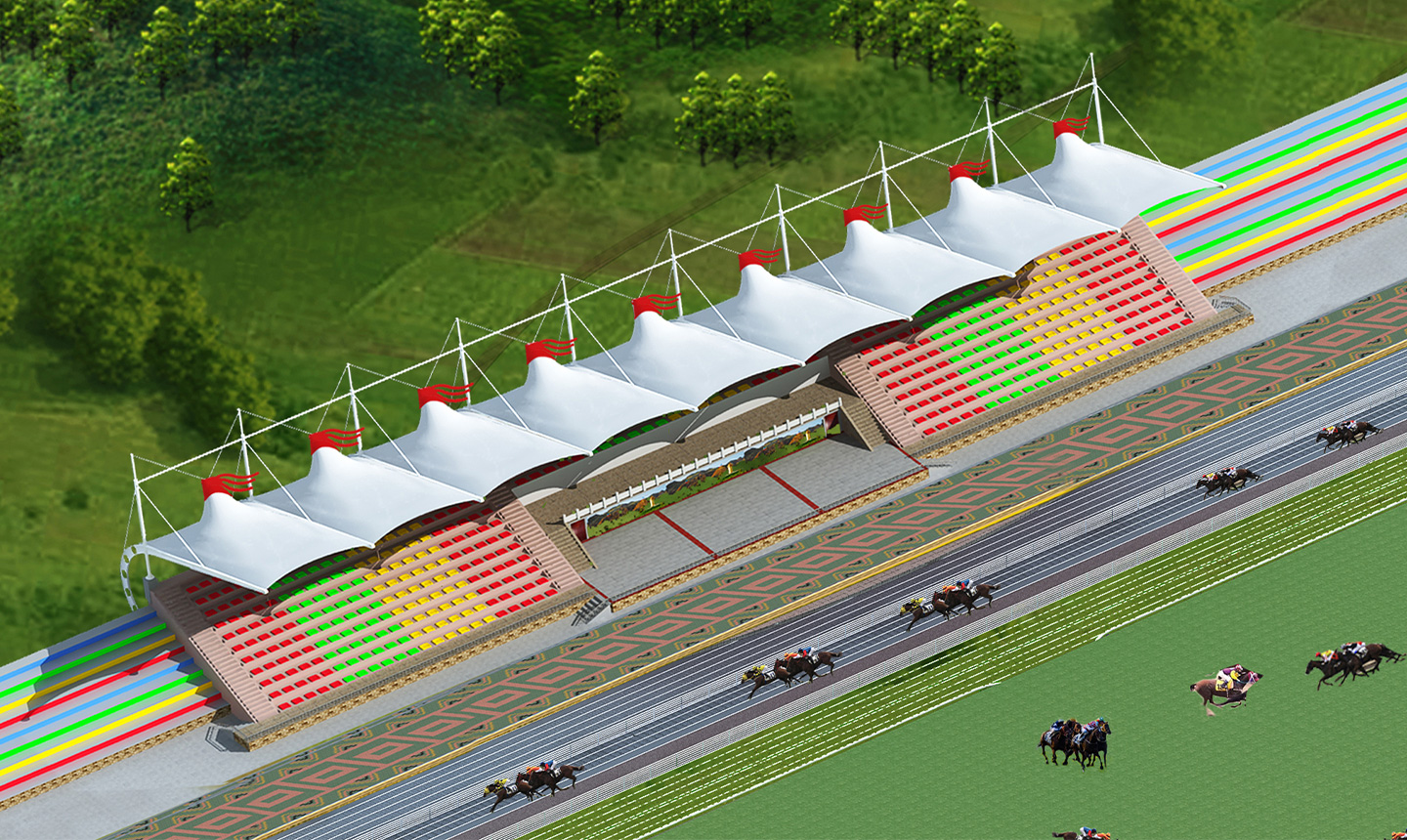 2、體育膜結構看臺的外觀設計一向都是露天的,所以在設計的時候我們需要注意它的承重力,因為一般都是單側建造或者環(huán)繞建造,必須有無數(shù)個支撐點才能讓整個頂子具有強抗風、抗震的功能 體育場看臺一般都是高大上的感覺,外觀別具特色,實用性也不錯。同時這種看臺在夏季比賽的時候,觀眾特別希望可以坐在遮陽效果好的一面,那么我們就需要把這些因素考慮進去。盡量讓設計大面積的有遮陽效果,最后在膜結構裁剪的時候要量好尺寸,這樣每塊材料才能很好的焊接成功。做到這些,一個完美又實用的體育場看臺就會很快展現(xiàn)在眼前了。