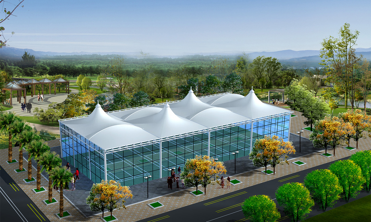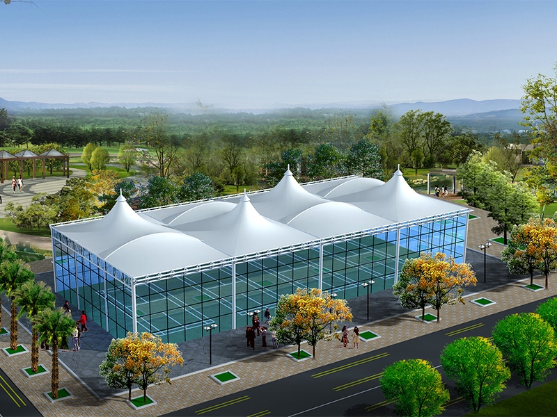 膜結(jié)構(gòu)屋面是一種大跨度空間膜結(jié)構(gòu),已廣泛應(yīng)用于體育場館、商業(yè)廣場屋頂?shù)却笮凸步ㄖ校渲蠩TFE和PTFE膜材料在工程中取得了良好的應(yīng)用效果。張拉膜工程大跨度膜結(jié)構(gòu)屋面具有工廠集中加工、機(jī)械施工、安裝效率高、無污染、造型獨(dú)特美觀等優(yōu)點(diǎn),是一種綠色建筑類別,符合當(dāng)代建筑發(fā)展趨勢,值得廣泛推廣使用。