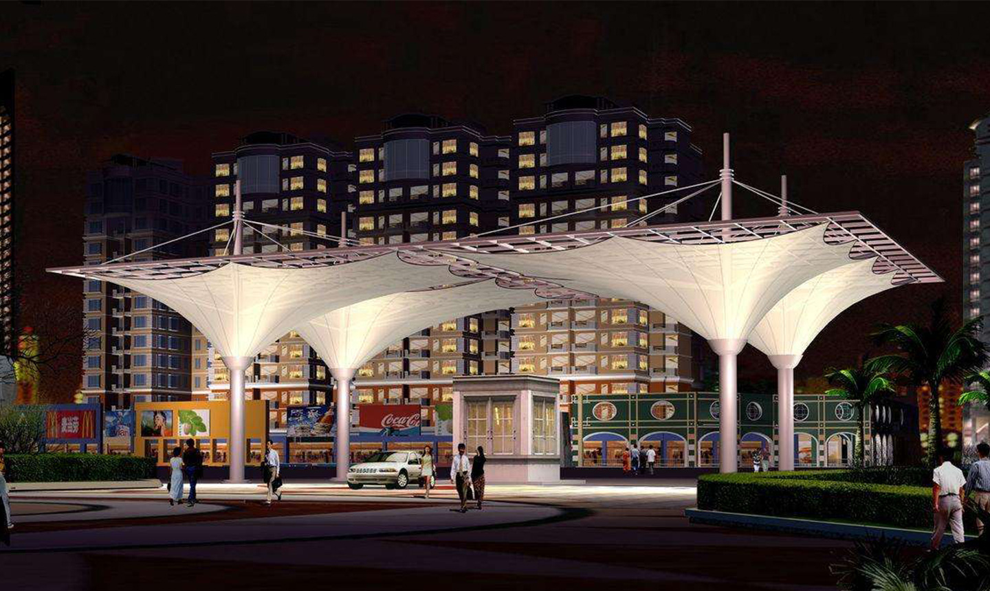 膜結(jié)構(gòu)由于其材料重量輕、支撐方式靈活的特點(diǎn)使其形狀變化多端,使設(shè)計(jì)者能夠充分發(fā)揮空間想象。大部分膜結(jié)構(gòu)工程的造型是非?;顫娖恋模そY(jié)構(gòu)工程不但打破了傳統(tǒng)建筑形式的沉悶,而且非常具有張力和雕塑感,能展現(xiàn)建筑形式的現(xiàn)代氣息,與傳統(tǒng)建筑的多線造型相比,膜結(jié)構(gòu)工程建筑以其優(yōu)美的曲線造型吸引人,與周邊建筑相輔相成的同時(shí)也讓人眼前一亮。特別是大型地標(biāo)利用奇特的膜結(jié)構(gòu)造型營(yíng)造夢(mèng)幻般的夜間景觀效果,增加其認(rèn)知度和商業(yè)效果。