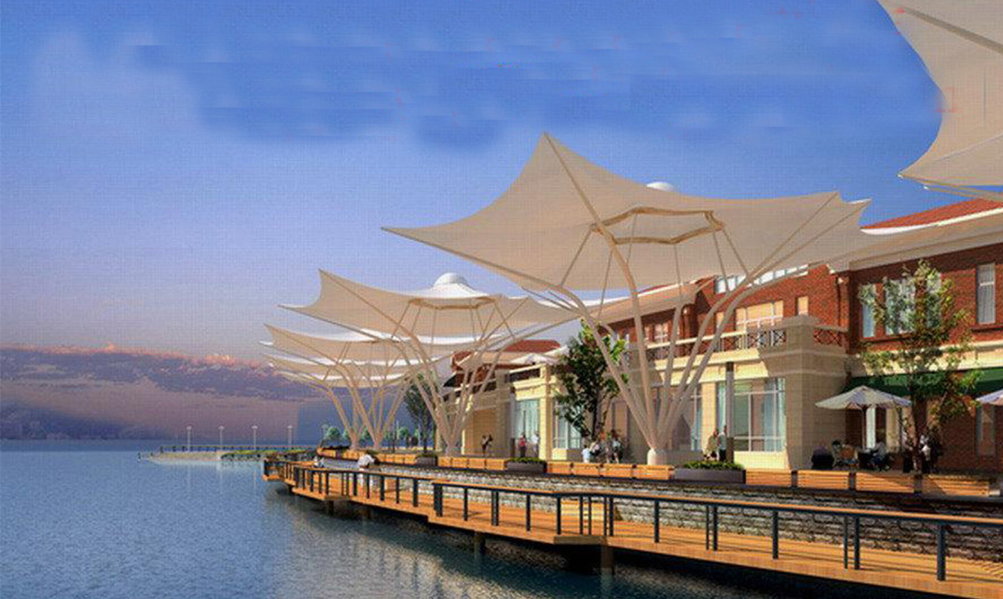 膜結(jié)構(gòu)景觀(guān)棚輕巧、別致的造型在停車(chē)場(chǎng)及候車(chē)廳的建設(shè)中起到重要作用,除了滿(mǎn)足防風(fēng)雨、防日曬等基本功能外,并有較好的標(biāo)識(shí)招攬效果,展現(xiàn)了人們個(gè)性化的一面。如果你想有陰影覆蓋或擴(kuò)大你的建筑特征,在短時(shí)間內(nèi)改變,除了木頭,石頭,金屬和玻璃材料的使用,另一種合適的材料是膜結(jié)構(gòu)景觀(guān)棚)。用PVC和PTFE膜,因此他們可以以低成本設(shè)計(jì)場(chǎng)館的屋頂結(jié)構(gòu)所需的形狀,這些材料可以被成功地用于幾乎所有的景觀(guān)或建筑環(huán)境,而且不受任何天氣條件的影響。膜結(jié)構(gòu)景觀(guān)棚的其他優(yōu)點(diǎn)是制造和安裝時(shí)間短,便宜的價(jià)格,高,拉伸和橫向的優(yōu)勢(shì)。
